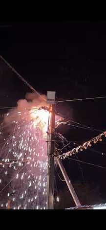 இந்த வளைவின் ஓரமாக இருந்த மின் கம்பத்தில் பிளாஸ்டிக் வயா்கள் ஒன்றோடு ஒன்று உரசியதில், திடீரென பயங்கர சப்தத்துடன் வெடித்து தீப்பற்றி எரிந்ததுடன், தீப்பொறிகள் சாலையில் விழுந்தன.
