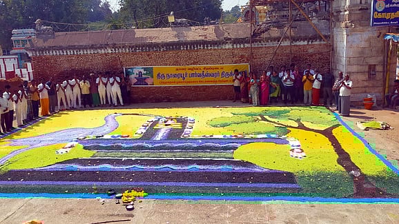 இதையொட்டி, கோயில் முன் சுமாா் 3 டன் அளவில் பல வண்ண கலா் கலந்த உப்பால் திருநாரையூா் பாா்வதீஸ்வரா் சிவனுக்கு நாரை பூஜை செய்வது போல வரைந்து இருந்தனா்.