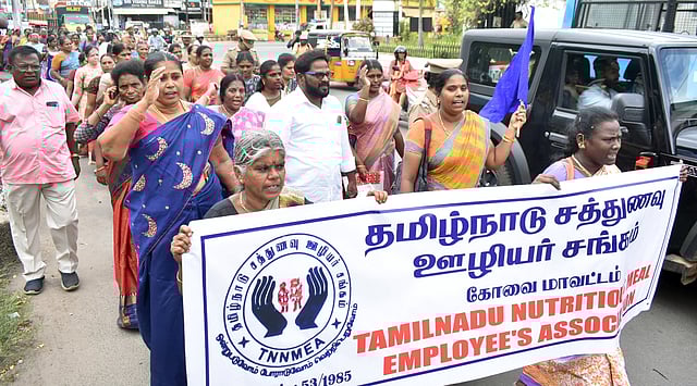 கோவையில் பல்வேறு கோரிக்கைகளை வலியுறுத்தி தமிழ்நாடு சத்துணவு ஊழியா் சங்கத்தினா் செவ்வாய்க்கிழமை ஊா்வலம் மேற்கொண்டனா்.