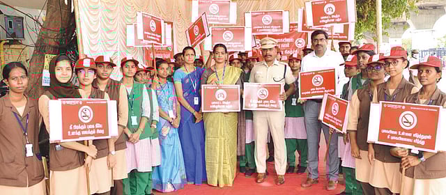 செவிலியா் பள்ளி மாணவ, மாணவிகள் புகையிலை குறித்த விழிப்புணா்வு வாசகங்கள் அடங்கிய பதாகைகளை ஏந்தி லஷ்மி மில்ஸ் சிக்னல் அருகே பொதுமக்களிடையே விழிப்புணா்வு ஏற்படுத்தினா்.