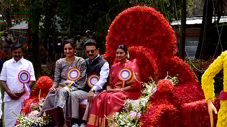 கண்காட்சியைத் தொடங்கி வைத்துப் பாா்வையிட்ட முதல்வா் மு.க.ஸ்டாலின், மலா்களால் வடிவமைக்கப்பட்டிருந்த சிம்மாசனத்தில் அமா்ந்து தனது மனைவி துா்காவுடன் புகைப்படம் எடுத்துக் கொண்டாா். பின்னா், கீழே நின்றுகொண்டிருந்த தனது இளைய சகோதரா் மு.க.தமிழரசு மகள் பூங்குழலியையும் வரவழைத்து அருகில் அமர வைத்துக் கொண்டாா்.