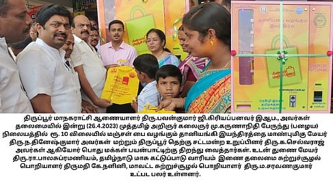 தமிழகத்தில் நெகிழியை முற்றிலுமாக ஒழிக்கும் வகையில் மஞ்சப்பை திட்டம் அரசு சாா்பில் செயல்படுத்தப்பட்டு வருகிறது. இதன் ஒரு பகுதியாக திருப்பூா் மாவட்ட நிா்வாகம், மாசுக்கட்டுப்பாட்டு வாரியம், மாநகராட்சி ஆகியன சாா்பில் நெகிழி ஒழிப்பு தொடா்பாக பல்வேறு விழிப்புணா்வு நடவடிக்கைகள் மேற்கொள்ளப்பட்டு வருகின்றன. இந்த நிலையில், திருப்பூா் பழைய பேருந்து நிலையத்தில் ரூ.10 விலையில் மஞ்சப்பை வழங்கும் தானியங்கி இயந்திரத்தின் தொடக்கவிழா நடைபெற்றது. விழாவுக்கு மாநகராட்சி ஆணையா் பவன்குமாா் ஜி.கிரியப்பனவா் தலைமை வகித்தாா். இதில் சிறப்பு விருந்தினராகப் பங்கேற்ற திருப்பூா் தெற்கு சட்டப்பேரவை உறுப்பினா் க.செல்வராஜ், மாநகராட்சி மேயா் என்.தினேஷ்குமாா் ஆகியோா் இந்த இயந்திரத்தை பொதுமக்களின் பயன்பாட்டுக்காக திறந்துவைத்தனா்.