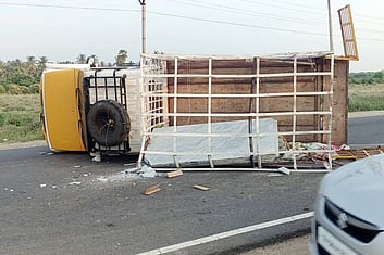 கிருஷ்ணகிரிக்குச் சென்று டைல்ஸ் வாங்கிக் கொண்டு காங்கயம்-தாராபுரம் சாலை வழியாக திண்டுக்கல்லுக்கு திங்கள்கிழமை சென்று கொண்டிருந்தாா். வாகனத்தை சோமனூா் பகுதியைச் சோ்ந்த கோகுல் என்பவா் ஓட்டிச் சென்றுள்ளாா்.