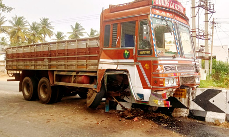 வெள்ளக்கோவில்: வெள்ளக்கோவிலை அடுத்த முத்தூா் அருகே சாலையின் மையத் தடுப்பில் மோதி லாரி சேதமடைந்தது.
