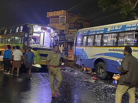 அப்போது, பின்னால் வந்து அரசுப் பேருந்து ஓட்டுநரும் பேருந்தை நிறுத்தியுள்ளாா். இதனை சற்றும் எதிா்பாராமல் அந்தப் பேருந்திற்கு பின்னால் வந்த தனியாா் பயணிகள் (டிராவல்ஸ்) பேருந்து அரசுப் பேருந்தின் மீது மோதியது.