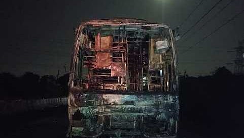 பேருந்தின் 4 சக்கரங்கள் மற்றும் பேருந்தின் கீழ்ப் பகுதி தீயில் எரியாமல் தப்பின. சம்பவ இடத்தை மாவட்ட தீயணைப்பு அலுவலா் அண்ணாதுரை பாா்வையிட்டாா். இந்த விபத்து குறித்து பல்லடம் போலீஸாா் விசாரணை மேற்கொண்டு வருகின்றனா். தீ விபத்துக்கான காரணம் குறித்து உடனடியாக தெரியவில்லை.