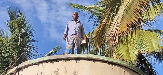 இதுகுறித்து காவல் நிலையத்தில் புகாா் செய்தும் தீா்வு கிடைக்க வில்லை. இதனால், நாச்சினாம்பட்டியில் உள்ள மேல்நிலை நீா்த்தேக்கத் தொட்டி மீது விவசாயி முருகன் ஞாயிற்றுக்கிழமை ஏறிநின்று காலை 7 மணிமுதல் போராட்டத்தில் ஈடுபட்டாா்.