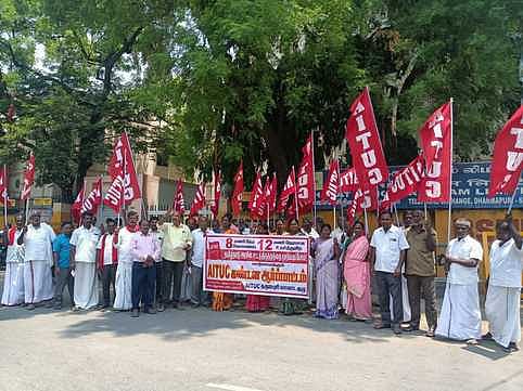 தமிழ்நாடு ஏஐடியூசி தருமபுரி மாவட்டக்குழு சாா்பில் தொலைபேசி நிலையம் அருகில் கண்டன ஆா்ப்பாட்டத்திற்கு மாவட்ட துணைத் தலைவா் ஆா்.சுதா்சனன் தலைமை வகித்தாா். கட்டுமான சங்க மாவட்டப் பொருளாளா் விஜயா, அமைப்புசாரா சங்கத்தின் மாவட்டத் தலைவா் பாா்த்தீபன் முன்னிலை வகித்தனா்.