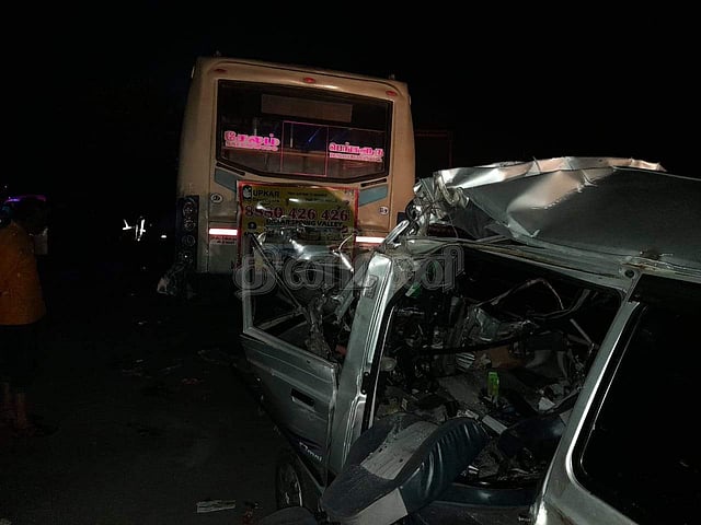 அப்போது அந்த வழியாக வேகமாக வந்த ஆம்னி கார் நின்றிருந்த பேருந்தின் மீது மோதியது. இதில் காரில் பயணம் செய்த ஐந்து ஆண்களும், பேருந்திலிருந்து கீழே இறங்கி நின்று கொண்டிருந்த ஒரு ஆண் பயணியும் நிகழ்விடத்திலேயே உயிரிழந்தனர்.