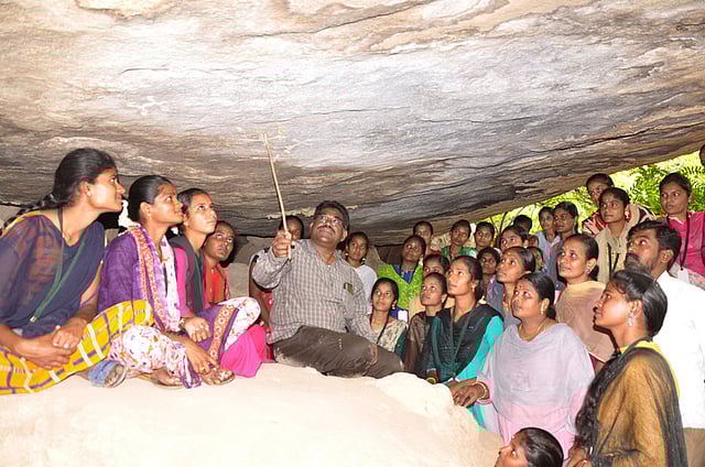 கிருஷ்ணகிரியை அடுத்த தாளாப்பள்ளி மலையில் அரசு கல்லூரி மாணவியருக்கு பாறை ஓவியம் குறித்து பயிற்சி புதன்கிழமை அளிக்கப்பட்டது.