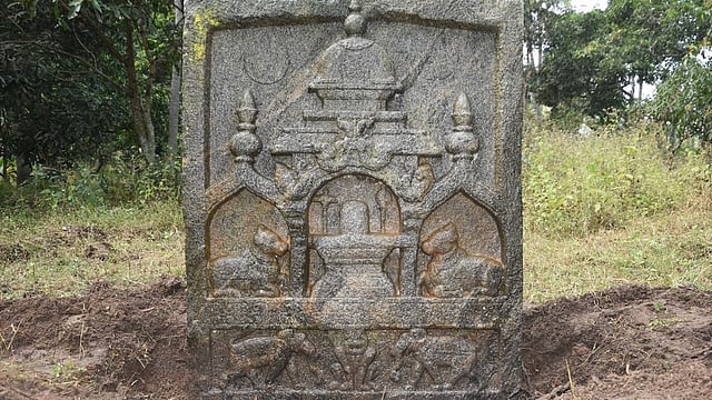 இதில், நான்கடிக்கு நான்கடி சதுரப் பலகை கல்லில் ஒரு கோயில் காட்டப்பட்டுள்ளது. அதன் கருவறையில் லிங்கம் உள்ளது. இருபுறமும் இரண்டு நந்திகள் லிங்கத்தை பாா்த்த வண்ணம் அமா்ந்துள்ளன. இவை அனைத்தும் ஒரு கோயிலைக் குறிக்கின்றன. இவற்றோடு இதில் காட்டியுள்ள சில அடையாளங்களை பாா்க்கும்போது இது கோயில் மட்டுமல்ல. நினைவுக்கல் என்பது தெரியவருகிறது.