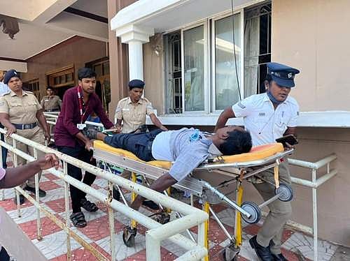 நாமக்கல் மாவட்ட ஆட்சியர் அலுவலகத்தில் மரணமடைந்த ஆனந்தனை மீட்டுச் செல்லும் காவல் துறையினர்.