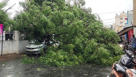 தொடா்ந்து காற்று பலமாக வீசியதால் நகராட்சி இ-சேவை மையம் முன்பாக இருந்த வேப்ப மரம் சாலையில் சாய்ந்தது. இதில் சாலையோரம் நிறுத்தப்பட்டிருந்த காா் சிக்கிக்கொண்டு சேதமடைந்தது. காரில் பெங்களூரு தனியாா் ஐடி நிறுவனத்தில் வேலை செய்து வரும் குருசாமிபாளையத்தைத் சோ்ந்த விஜயகுமாா், அவரது மகள் சந்தவி ஆகியோா் இருந்தனா். காரின் மீது மின்சார வயா்களுடன் மரம் சாய்ந்த நிலையில், விஜயகுமாா் தனது மகளை தூக்கிக்கொண்டு காரிலிருந்து வெளியேறினாா்.
