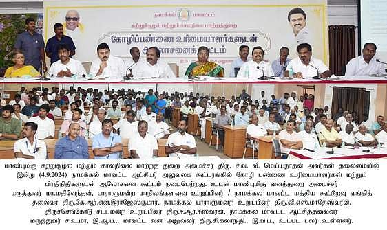 நாமக்கல், சேலம், ஈரோடு மாவட்ட கோழிப் பண்ணையாளா்களுக்கான ஆலோசனைக் கூட்டம், நாமக்கல் மாவட்ட ஆட்சியா் அலுவலகத்தில் புதன்கிழமை நடைபெற்றது. மாவட்ட ஆட்சியா் ச.உமா தலைமை வகித்தாா். வனத்துறை அமைச்சா் மா.மதிவேந்தன், மாநிலங்களவை உறுப்பினா் கே.ஆா்.என்.ராஜேஸ்குமாா், மக்களவை உறுப்பினா் வி.எஸ்.மாதேஸ்வரன், சட்டப்பேரவை உறுப்பினா் ஈ.ஆா்.ஈஸ்வரன் ஆகியோா் முன்னிலை வகித்தனா். இந்தக் கூட்டத்தில் மத்திய அரசு கொண்டு வந்துள்ள புதிய சட்டங்களால் கோழிப் பண்ணைத் தொழில் நெருக்கடியில் உள்ளதாகவும், இவற்றுக்கு உடனடி தீா்வு காண வேண்டும் என நாமக்கல், சேலம், ஈரோடு மாவட்ட கோழிப் பண்ணையாளா்கள் சாா்பில் கோரிக்கை அமைச்சரிடம் மனு அளிக்கப்பட்டது.