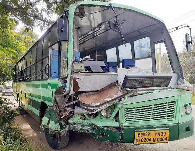 இந்த சம்பவத்தில் விபத்துக்குள்ளான வேன் முற்றிலும் சேதமடைந்தது. அரசுப் பேருந்தின் முன்பகுதி பலத்த சேதமடைந்தது.