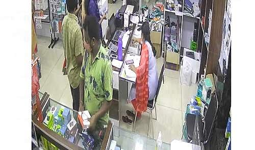 அப்போது செல்போன் ப்ளூடூத் ஹெட்செட் வாங்குவது போல் வாங்கி பார்த்துக் கொண்டு இருந்தார். பின்னர் அருகே மேஜையில் வைக்கப்பட்டிருந்த செல்லிடப்பேசி மீது அந்த அட்டைப் பெட்டியை வைத்து மறைத்து செல்போனை எடுத்து சென்றுள்ளார்.