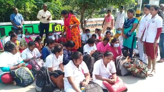 கரோனா 3-வது அலை காலத்திலும் பல்வேறு இன்னல்களுக்கு மத்தியில் மருத்துவக் கவுன்சிலால் நியமனம் செய்யப்பட்ட செவிலியர்கள் பணி செய்து வந்தனர். இது போன்ற செவிலியர்கள் தமிழகம் முழுவதும் 2400-க்கும் மேற்பட்டோர் உள்ளனர். தற்போது தமிழக அரசு அவர்களை பணியிலிருந்து விடுவித்துள்ளனர். அரசின் இந்த நடவடிக்கையைக் கண்டித்தும் கரோனா காலத்தில் தேவதைகளாக நினைத்த எங்களை தெருவில் விட்டுவிட்டனர் என வருத்தம் தெரிவித்தும் செவிலியர்கள் போராட்டத்தில் ஈடுபட்டனர்.