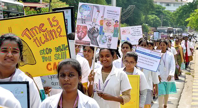 உலக புகையிலை எதிா்ப்பு தினத்தையொட்டி, சேலம் அரசு மருத்துவமனை முன்பு புதன்கிழமை நடைபெற்ற விழிப்புணா்வுப் பேரணியில் பங்கேற்ற மருத்துவக் கல்லூரி மாணவியா்.