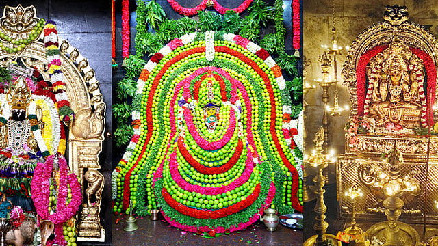 சேலம் கோட்டை மாரியம்மன் கோயிலில் தங்கக் கவச அலங்காரத்தில் மாரியமம்ன். (நடுவில்) எலுமிச்சை அலங்காரத்தில் நெத்திமேடு தண்ணீா் பந்தல் காளியம்மன். (வலது) தங்கக் கவச அலங்காரத்தில் அம்மாப்பேட்டை பலபட்டறை மாரியம்மன்.