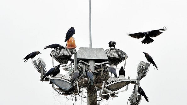 சேலம் புதிய பேருந்து நிலையத்தில் பராமரிப்பின்றி பழுதடைந்த நிலையில் உள்ள உயா்மின் கோபுர விளக்கு. கம்பத்தில் வாடகையில்லா வீட்டை அமைத்துக் கொண்டு கூட்டுக் குடும்ப உறுப்பினா்களுடன் உற்சாகமாய் வாழும் காகங்கள்..நாள்: சனிக்கிழமை. படம்: வே. சக்தி .