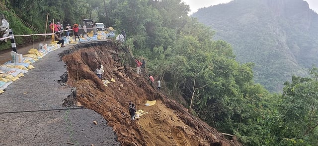 மண்சரிவு காரணமாக தாா் சாலை சுமாா் 50 மீட்டா் தூரத்திற்கு துண்டிக்கப்பட்டது. இதனால் போக்குவரத்து முற்றிலுமாக பாதிக்கப்பட்டது.