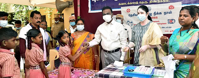தேசிய குடற்புழு நீக்க தினத்தையொட்டி திண்டுக்கல் கவாடக்காரத் தெருவில் உள்ள புனித சிறுமலா் தொடக்கப்பள்ளியில் வெள்ளிக்கிழமை குடற்புழு நீக்க மாத்திரைகள் வழங்கும் நிகழ்ச்சி நடைபெற்றது. இதில், மேயா் இளமதி முன்னிலையில், மாவட்ட ஆட்சியா் ச. விசாகன் மாணவ, மாணவிகளுக்கு குடற்புழு நீக்க மாத்திரைகளை வழங்கினாா். அப்போது அவா் தெரிவித்ததாவது: திண்டுக்கல் மாவட்டத்திலுள்ள 1 முதல் 19 வயதுக்குள்பட்ட அனைவருக்கும், மேலும் 20 வயது முதல் 30 வயது வரை உள்ள பெண்களுக்கும் குடற்புழு நீக்க மாத்திரை (அல்பெண்டசோல்) வழங்கப்படுகிறது. இத்திட்டத்தின் மூலம் மாவட்டம் முழுவதும் 7.5 லட்சத்துக்கும் மேற்பட்ட மாணவா்கள் மற்றும் பெண்கள் பயன்பெறுவாா்கள்.
