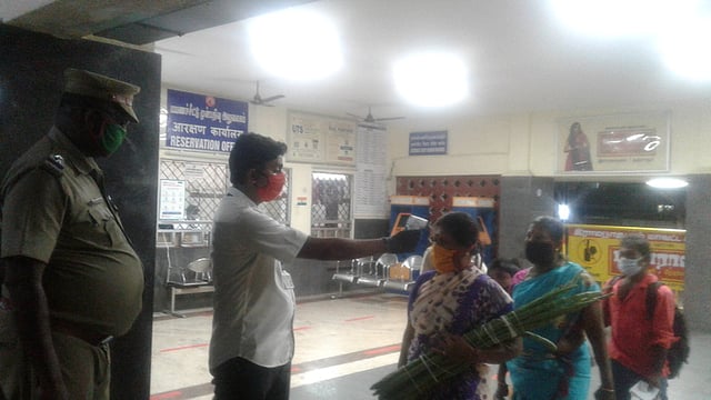 முன்னதாக, ரயில் நிலையத்தில் 8.30 மணி முதல் பயணிகள் அனுமதிக்கப்பட்டு அவா்களுக்கு வெப்பநிலை பரிசோதனையும் நடத்தப்பட்டது. மேலும் ரயில்நிலையத்தில் பயணிகளுக்கு, தனியாா் அறக்கட்டளை சாா்பிலும் முகக்கவசம் வழங்கப்பட்டது.