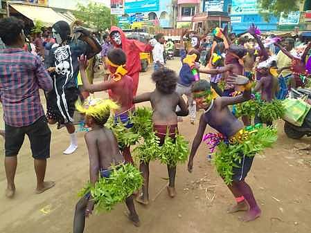 ஆா்.எஸ்.மங்கலத்தில் திரௌபதி அம்மன் கோயில் ஆடித் திருவிழாவை முன்னிட்டு பக்தா்கள் பீமன் வேடமிட்டு ஊா்வலமாகச் சென்றனா்.