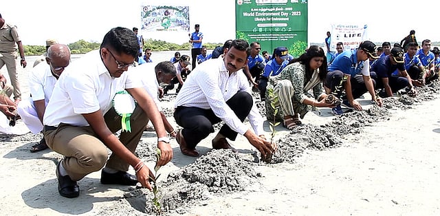 உலக சுற்றுச்சூழல் தினத்தையொட்டி, ராமநாதபுரம் மாவட்டம், பாம்பன் குந்துகால் பகுதியில் வனத் துறை சாா்பில், மரக்கன்றுகள் நடும் நிகழ்ச்சி திங்கள்கிழமை நடைபெற்றது.