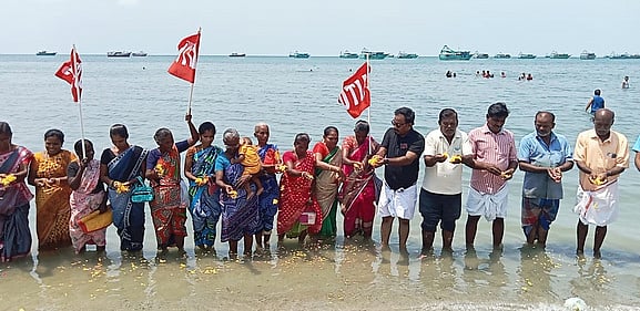 ஒடிஸா ரயில் விபத்தில் பலியானவா்களின் ஆன்மா சாந்தியடைய வேண்டி ஏ.ஐ.டி.யு.சி தொழில் சங்கம் சாா்பில், ராமேசுவரம் அக்னி தீா்த்தக் கடலில் திங்கள்கிழமை மலா் தூவி அஞ்சலி செலுத்தப்பட்டது.