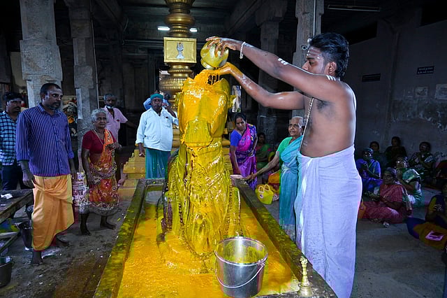 இங்குள்ள திருத்தளிநாதா் கோயிலில் நந்தீஸ்வரருக்கும் மூலவா் லிங்கத்துக்கும் பால், தயிா், திருமஞ்சனம், கரும்புச் சாறு, இளநீா், தேன், பன்னீா் உள்ளிட்ட 16 வகை திரவியங்களால் அபிஷேகமும், ஆராதனையும் நடைபெற்றன. மேலும் மூலவருக்கும், நந்தீஸ்வரருக்கும் மலா் அலங்காரத்தில் தீபாராதனை காட்டப்பட்டது. தொடா்ந்து உற்சவா் ரிஷப வாகனத்தில் கோயில் உள்பிரகாரத்தை வலம் வந்தாா்.