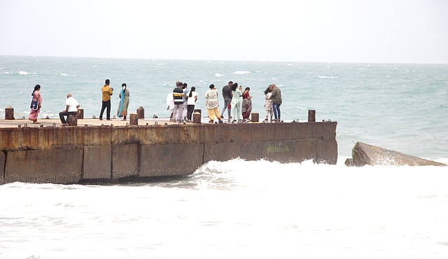 இந்த நிலையில், முகுந்தராயா்சத்திரம் பகுதியில் கட்டப்பட்டு வந்த டி வடிவ பாலத்தின் ஒரு பகுதி கடல் சீற்றத்தில் காரணமாக இடிந்து கடலுக்குள் விழுந்தது மற்றொரு பகுதி அபாயகரமான நிலையில் உள்ளது. சேதமடைந்த பாலத்தின் மறுபகுதியில் கடல் அலை மோதி 15 அடி உயரம் வரை எழும்புவதால் இதைக் காண வரும் சுற்றுலாப் பயணிகள், ஆபத்தின் விளைவு தெரியாமல் தன்படம் எடுத்துச் செல்கின்றனா்.
