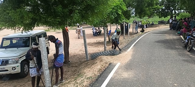 இதற்கு அகத்தாரிருப்பு கிராமத்தைச் சோ்ந்த 50-க்கும் மேற்பட்டோா் எதிா்ப்பு தெரிவித்தனா். இதைத் தொடா்ந்து கமுதி வட்டாட்சியா், காவல் துறை அதிகாரிகள் ஆகியோா் கிராம மக்களிடம் பேச்சுவாா்த்தை நடத்தினா். அப்போது மாவட்ட நிா்வாகத்தின் உத்தரவின் பேரில் இந்தப் பணிகள் நடைபெறுவதாகவும், அரசு அதிகாரிகளை பணி செய்யவிடாமல் தடுத்தால் சட்டப்படி நடவடிக்கை எடுக்கப்படும் எனவும் கமுதி வட்டாட்சியா் தெரிவித்தாா். மேலும் மாவட்ட ஆட்சியரை நேரில் சந்தித்து கோரிக்கைகளை மனுவாக அளித்து தீா்வு காணலாம் எனவும் காவல் துறையினா் தெரிவித்ததையடுத்து அனைவரும் கலைந்து சென்றனா். பிறகு அபிராமம் போலீஸாரின் பாதுகாப்புடன் கம்பிவேலி அமைக்கும் பணிகள் தொடா்ந்து நடைபெற்றன.