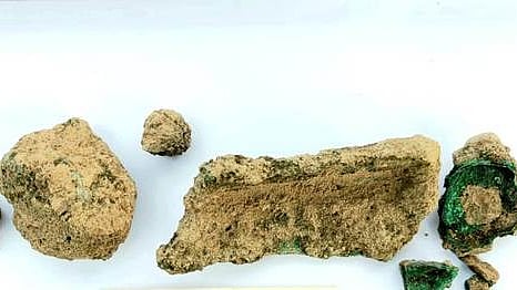 இந்த நிலையில், மற்றொரு அகழாய்வுக் குழியிலிருந்து நான்கு அடி ஆழத்தில் உடைந்த பச்சை வண்ண செப்புப் பொருள்கள் கண்டெடுக்கப்பட்டன. 8 துண்டுகளாகக் கிடைத்துள்ள இந்த செப்புப் பொருள்களில் ஒன்று பெரியதாகவும், மற்றவை சிறியதாகவும் உள்ளன. சில செப்புப் பொருள்களில் பச்சை வண்ணம் தெளிவாகத் தெரிகிறது.
