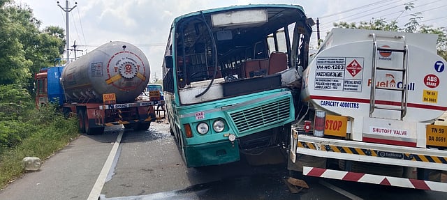 டீசல் லாரியைப் பின்தொடர்ந்து வந்த எரிவாயு லாரியும் அரசுப் பேருந்து மீது மோதியதில், மூன்று வாகனங்களும் நொறுங்கி சாலையோரப் பள்ளத்தில் இறங்கின.