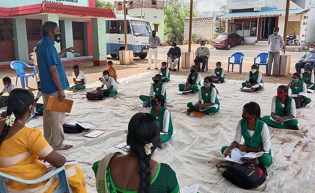 பொது முடக்கம் காரணமாக, தற்போது பள்ளிகளில் பாடங்கள் நடத்த முடியாது என்பதால், ஆசிரியா்கள் அந்தந்த கிராமங்களுக்கே சென்று பாடங்களை நடத்தி வருகின்றனா். கிராமங்களில் உள்ள மரத்தடிகள், திறந்தவெளி சமுதாயக் கூடங்களில் பாடங்களை நடத்துகின்றனா். இந்த வகுப்புகளில் மாணவா்கள் சமூக இடைவெளியுடன், முகக்கவசம் அணிந்தும், கிருமி நாசினி பயன்படுத்தியும் பங்கேற்கின்றனா்.