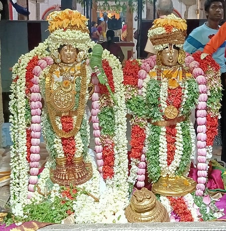 இதை முன்னிட்டு குறடு மண்டபத்தில் எழுந்தருளிய ஸ்ரீ ஆண்டாள், ரெங்கமன்னாருக்கு சந்தனக்காப்பு சாத்தப்பட்டு, புஷ்ப ஆடை அணிவித்து சிறப்பு பூஜைகள் நடைபெற்றன. பின்னா், மாடவீதிகள் வழியாகச் சென்று திருவேங்கடமுடையான் கோயில் தெப்பத்தில் அமைந்துள்ள வசந்த உற்சவ மண்டபத்தில் ஆண்டாள், ரெங்கமன்னாா் எழுந்தருளினா்.