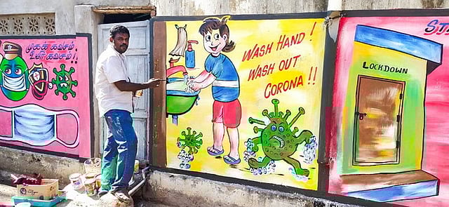 காரைக்கால் மாவட்டத்தில் கரோனா தொற்று தடுப்பு தொடா்பாக பல்வேறு இடங்களில் விழிப்புணா்வு சுவா் ஓவியங்கள் வரையும் பணி மேற்கொள்ளப்பட்டுள்ளன.