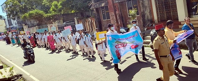 அன்னை தெரஸா சுகாதார பட்டமேற்படிப்பு மையம், இமாகுலேட் செவிலியா் கல்லூரியிலிருந்து சுமாா் 200 மாணவ, மாணவிகள், இருதயத்தை பாதுக்காக வேண்டியதன் அவசியத்தை வலியுறுத்தும் விதமாக, கருத்துகள் எழுதப்பட்ட பதாகைகளை ஏந்தி, முழக்கமிட்டவாறு சென்றனா்.