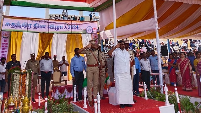 காரைக்கால்: காரைக்காலில் சுதந்திர தின கொண்டாட்டத்தில் தேசியக் கொடியை புதுவை அமைச்சர் பி.ஆர்.என். திருமுருகன் ஏற்றிவைத்தார்.