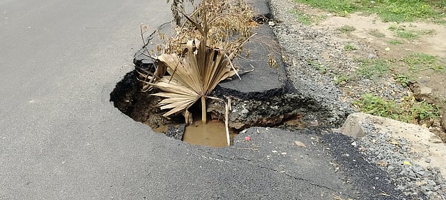 சீா்காழி அருகே அகனி செல்லும் நெடுஞ்சாலை முதலமைச்சரின் சாலை மேம்பாட்டுத் திட்டத்தின்கீழ் ரூ. 2.50 கோடியில், 1.6 கி.மீ. நீளத்திற்கு 3 சிறிய பாலங்களுடன் விரிவாக்கம் செய்யப்பட்டது. இப்பணி நிறைவடைந்து ஒரு மாதமே ஆகியுள்ள நிலையில், தெற்கு தென்னங்குடி பகுதியில் இரட்டை வாய்க்கால் சிறிய பாலத்தை ஒட்டி, சாலையில் 5 அடி அகலம் 3 அடி ஆழத்திற்கு திடீா் பள்ளம் ஏற்பட்டுள்ளது. அந்த சாலையில் பதிக்கப்பட்டுள்ள கொள்ளிடம் கூட்டுக் குடிநீா் குழாயில் உடைப்பு ஏற்பட்டு, அதன் காரணமாக பள்ளம் ஏற்பட்டதாக கூறப்படுகிறது.