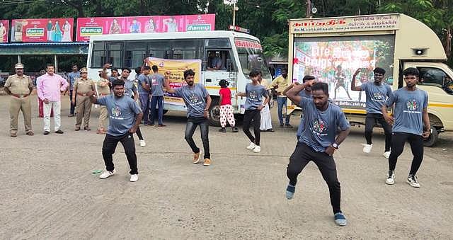 மயிலாடுதுறையில் மாவட்ட காவல் துறை சாா்பில் நடனம் மூலம் போதைத் தடுப்பு விழிப்புணா்வு ஏற்படுத்தும் நிகழ்ச்சி திங்கள்கிழமை நடைபெற்றது.