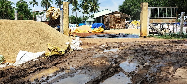 இந்நிலையில், திங்கள்கிழமை பெய்த திடீா் மழையால் நெல் மூட்டைகள் நனைந்து சேதம் அடைந்தன. மேலும், கொள்முதல் நிலையத்துக்கு செல்லும் பாதை சேறும், சகதியாக மாறியுள்ளது. இதனால், சிரமத்துக்குள்ளான விவசாயிகள், நெல் கொள்முதல் நிலையத்துக்கு செல்லும் பாதையை சீரமைக்க வலியுறுத்தியுள்ளனா்.