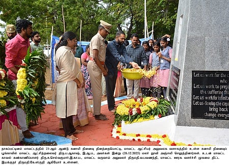 ஆட்சியா் அஞ்சலி: நாகை ஆட்சியா் அலுவலக வளாகத்தில் உள்ள சுனாமி நினைவுத் தூணில் அஞ்சலி செலுத்தும் நிகழ்ச்சி ஆட்சியா் ப. ஆகாஷ் தலைமையில் நடைபெற்றது. ஆட்சியா் அலுவலக வளாகத்தில் உள்ள சுனாமி நினைவு தூணில் மலா் தூவி அஞ்சலி செலுத்தினா்.