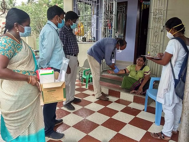 கூத்தாநல்லூர் நகராட்சியில் கரோனா தடுப்புக்காக பரிசோதனை செய்ய ரத்த மாதிரி எடுக்கப்பட்டது.