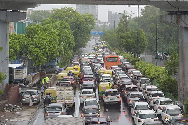 தில்லியில் பெய்து வரும் கனமழையால் நகரின் பல இடங்களில் வெள்ள நீர் தேங்கியுள்ளதால் போக்குவரத்து பாதிக்கப்பட்டுள்ளது.