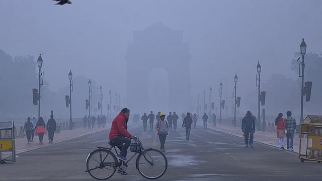 தில்லியில் சனிக்கிழமை காலை அடா்த்தியான மூடுபனி சூழ்ந்தது. காற்றின் தரம் ‘மிகவும் மோசம்’ பிரிவில் இருந்தது.