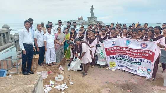 கன்னியாகுமரி முக்கடல் சங்கமம் கடற்கரைப் பகுதியில், அகஸ்தீஸ்வரம் விவேகானந்தா கல்லூரியின் நாட்டு நலப்பணித் திட்ட மாணவிகள் புதன்கிழமை தூய்மைப் பணியில் ஈடுபட்டனா்.