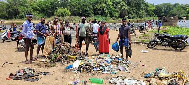 முக்கூடலில் தாமிரவருணி ஆற்றில் அருள்மிகு முத்துமாலையம்மன் கோயில் அமைந்துள்ள பகுதியில் தன்னாா்வ தொண்டா்கள் ஞாயிற்றுக்கிழமை தூய்மைப் பணியில் ஈடுபட்டனா்.