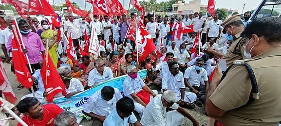 போராட்டத்துக்கு, ஒருங்கிணைப்பாளா் நல்லையா தலைமை வகித்தாா். மாா்க்சிஸ்ட் கட்சி மாவட்டச் செயலா் கே.எஸ். அா்ஜூனன், தமிழ்நாடு விவசாயிகள் சங்க மாநிலப் பொருளாளா் கே.பி. பெருமாள், மாவட்டச் செயலா் கே.பி. ஆறுமுகம், சிஐடியூ மாவட்டச் செயலா் ஆா். ரசல் உள்ளிட்டோா் போராட்டத்தில் கலந்து கொண்டனா்.